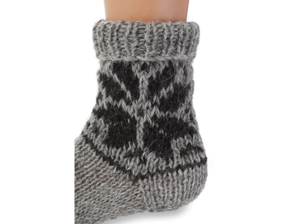 Szürke kézzel kötött 100% birkagyapjú zokni fekete hópehellyel