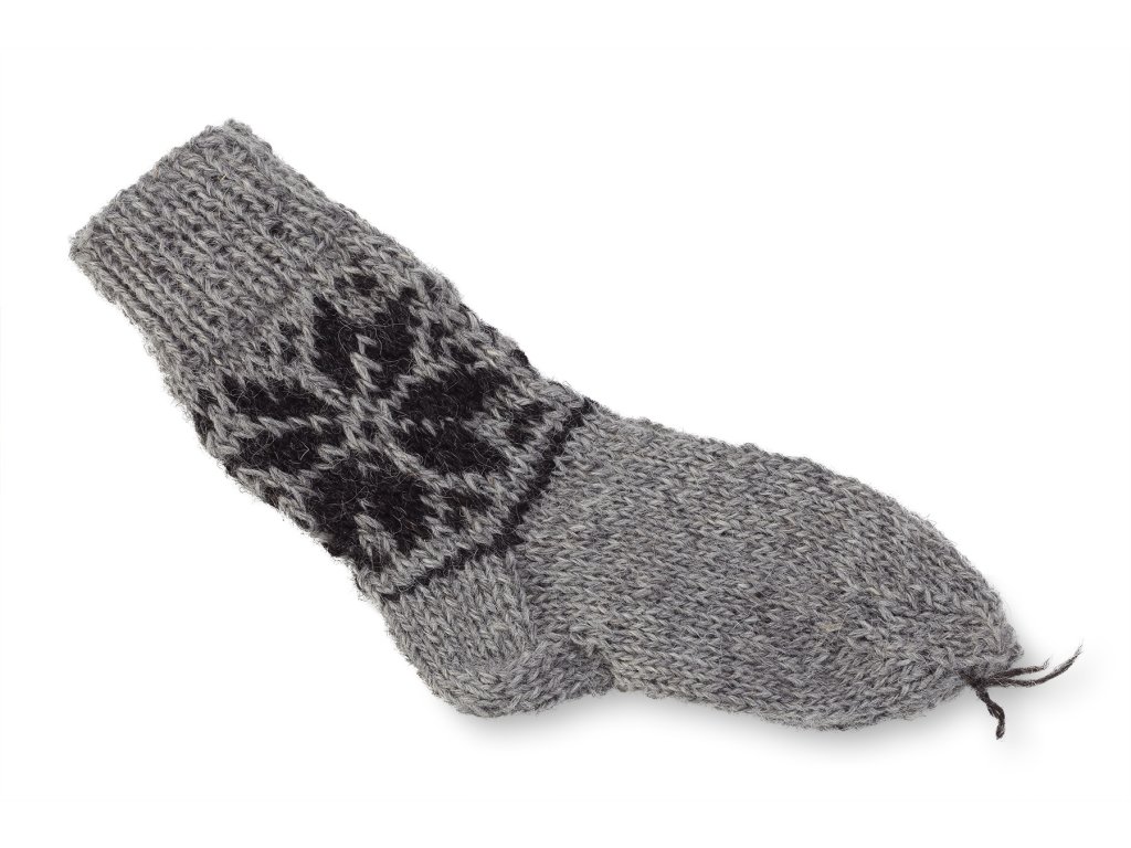 A világosszürke színű gyapjú zokni kézzel kötött, 100% birkagyapjúból. A felhasznált anyagnak köszönhetően a zokni alkalmazkodik a lábfej méretéhez. A zokni boka tájékán egy feltűnő, fekete színű hópehely található.