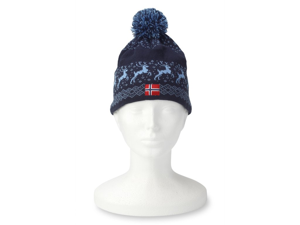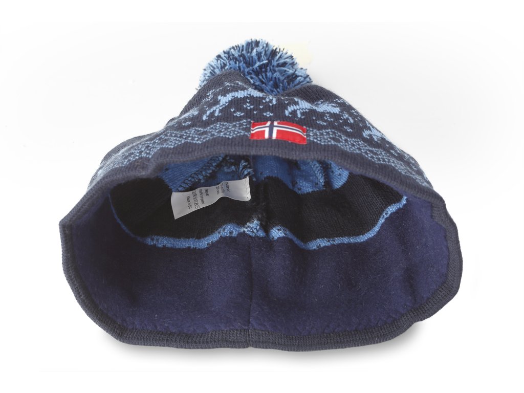 Sötétkék színű, pomponos téli sapkák északi motívumokkal (rénszarvas). A gyapjú sapka külső felülete gépi kötésű. Ez a téli sapka kb. 8 cm-es dupla szegéllyel rendelkezik a homloknál, a füleknél és a tarkónál. Ez nagyon kényelmessé teszi a sapka viselését, mivel a dupla szegélynek köszönhetően kellemes meleget biztosít a homlok, a fülek és a tarkó problémás területein, különösen télen. A belső kötés puha polár anyagból készült, amely nagyon finom és meleg tapintású.