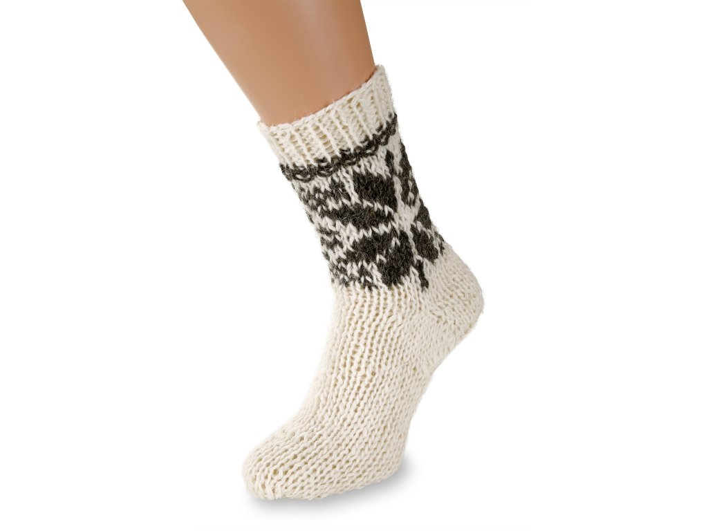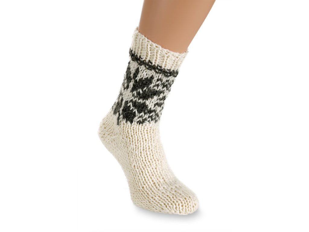 Világos kézzel kötött 100% birkagyapjú zokni hópehellyel