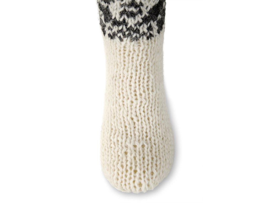 A fehér színű gyapjú zokni kézzel kötött, 100% birkagyapjúból. A felhasznált anyagnak köszönhetően a zokni alkalmazkodik a lábfej méretéhez. A zokni boka tájékán egy feltűnő, sötét színű hópehely található.