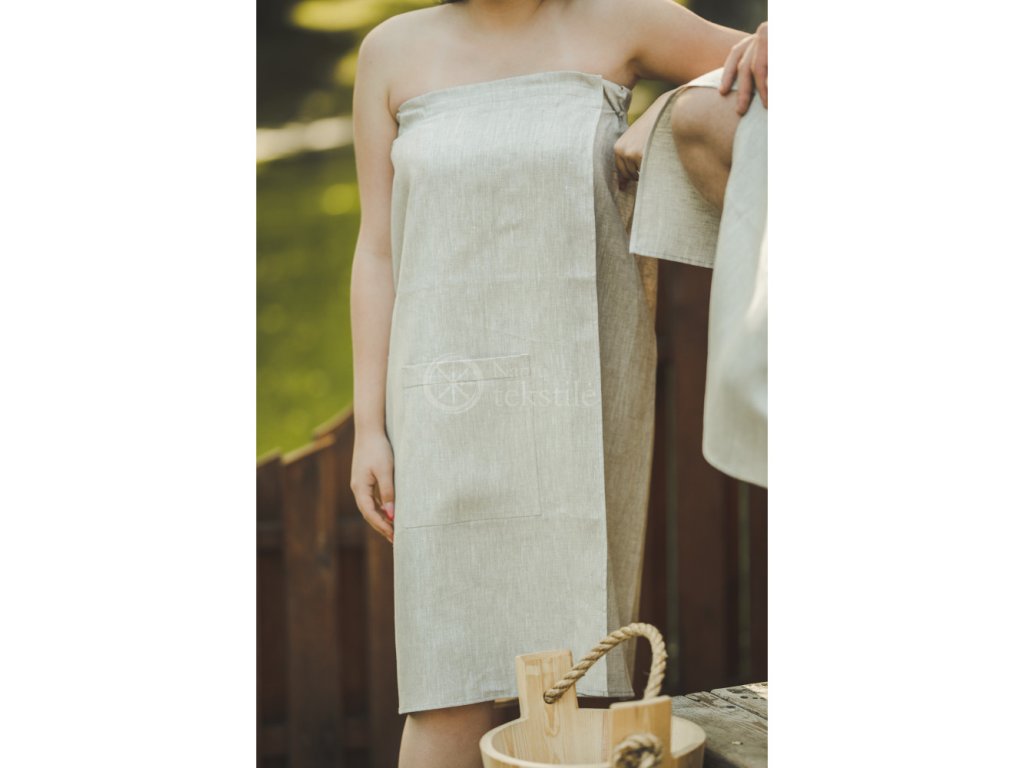 A női szaunaruhát úgy viselik, hogy az eltakarja a mellkastól a térdig érő területet. Elöl tépőzárral rögzíthető.