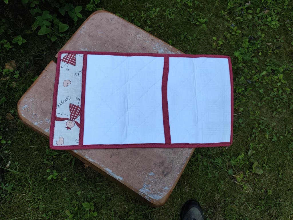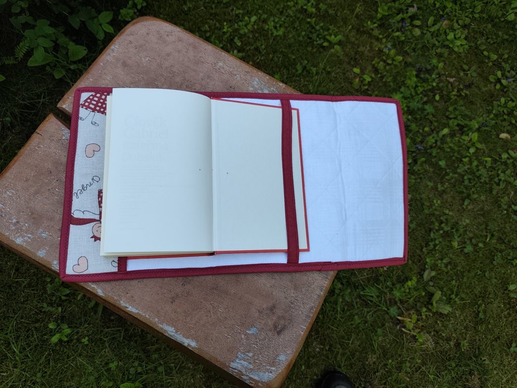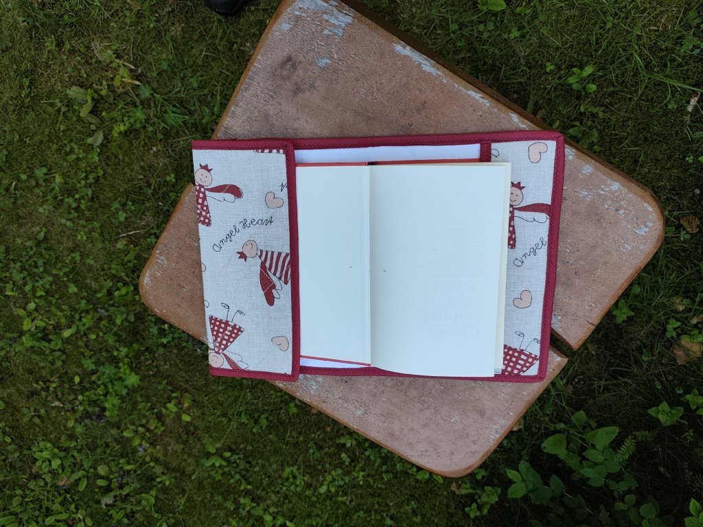A védő könyvborító nagyon praktikus kiegészítő minden könyvbarát számára. A borító szürke színű pamutból készült, kívülről piros és fehér színű, vidám kerubok motívumával. A belső oldal műanyaggal van megerősítve, hogy megtartsa az alakját. A borítót körben piros szegély szegélyezi.