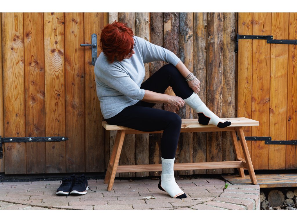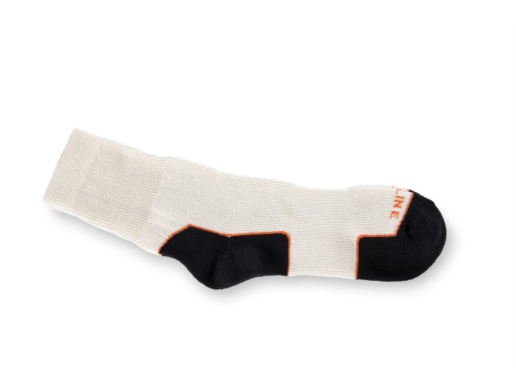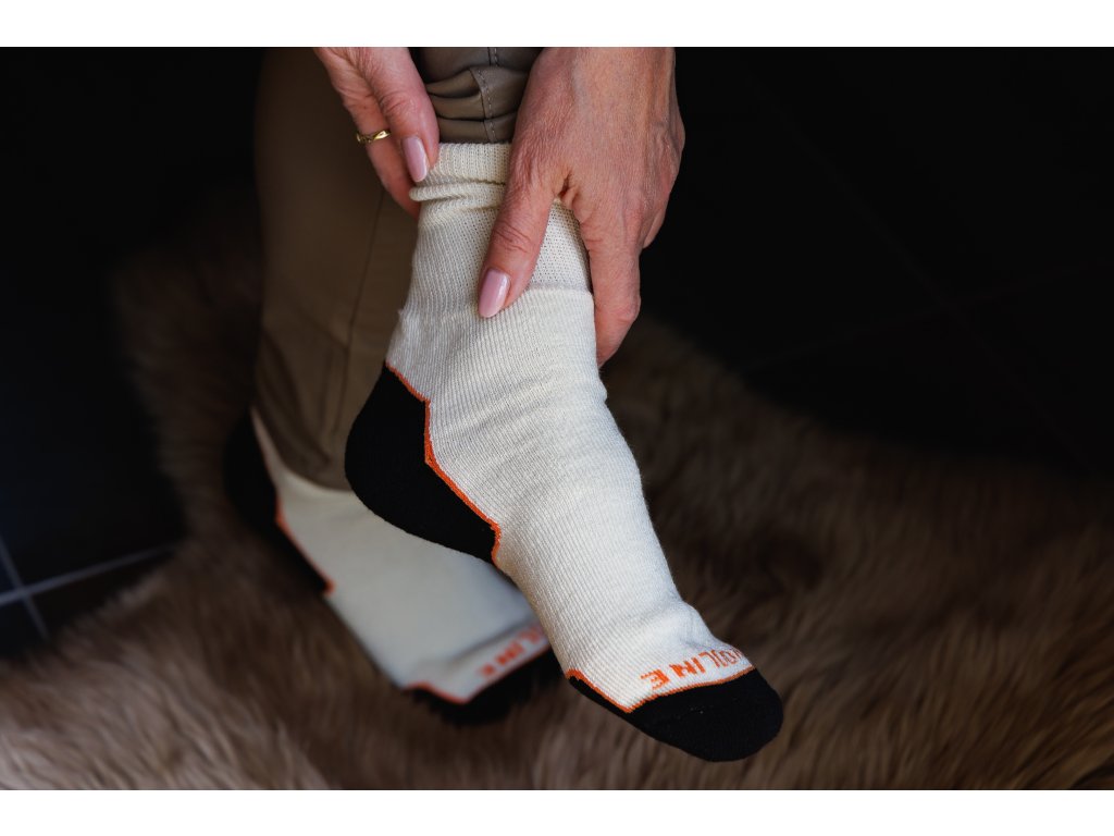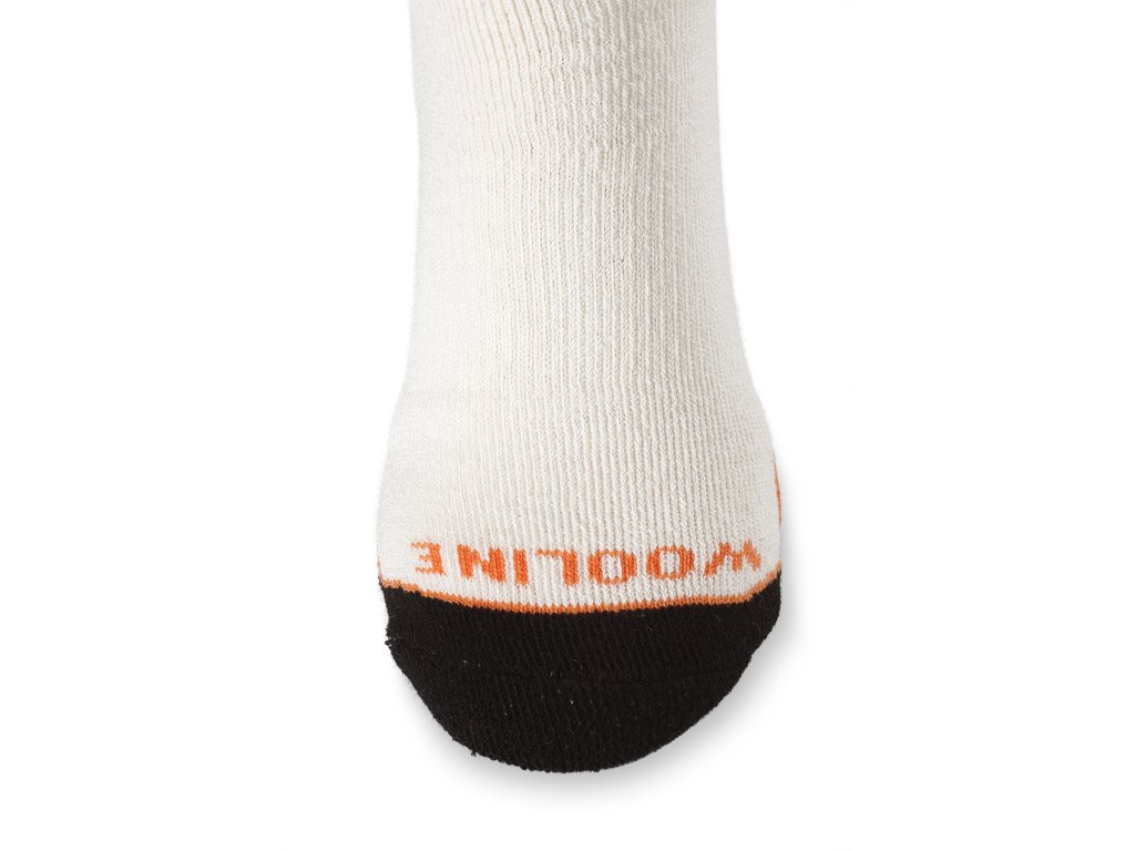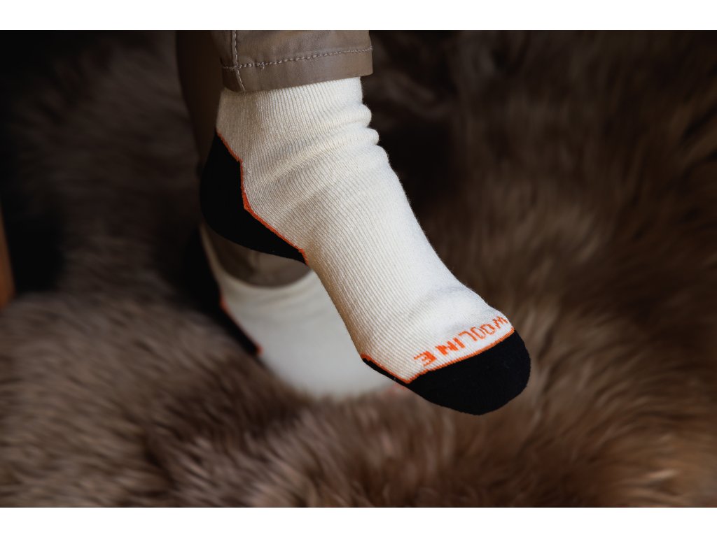 A 95% finom merinó gyapjúból készült Wooline sportzokni 5% végtelenített fonallal van dúsítva, hogy biztosítsa a zokni megfelelő elasztikus tulajdonságát mozgás közben. A merinó zoknik anatómiai formájúak. A frottír puhítás a talp felületen található, és ennek köszönhetően bőven van hely az ujjak számára. A zokninak finom, laza szegélye van a vádli területén.