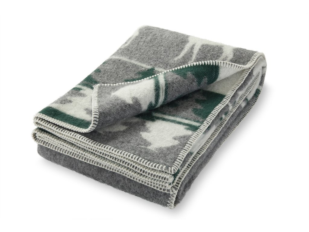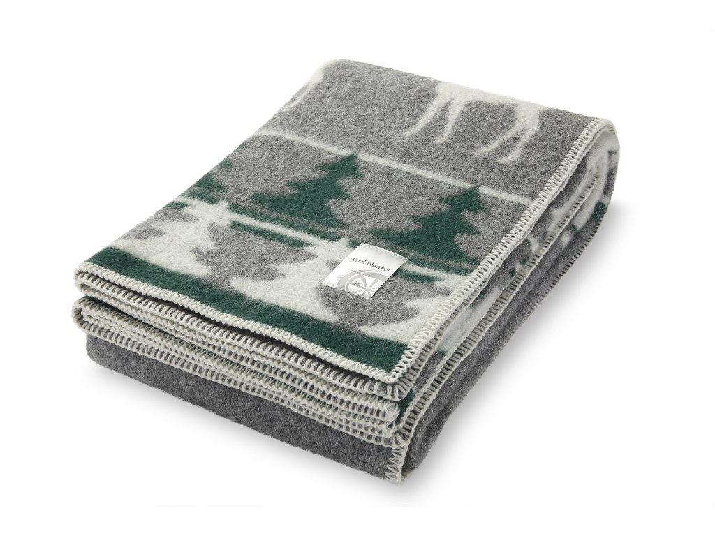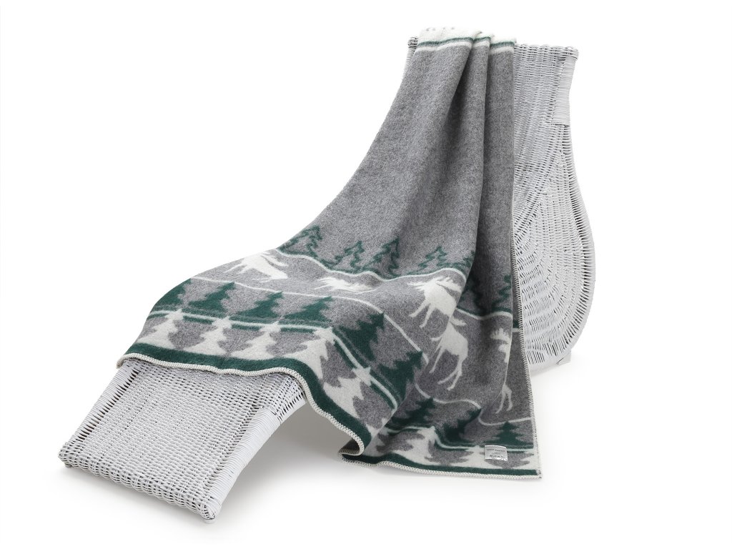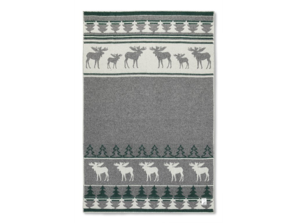 Anyag: 88% új-zélandi juhgyapjú, 12% pamut; Méret: 130 x 200 cm, Szín: szürke-zöld-fehér, Megjelenített motívum: rénszarvas, Súly: 1, 2 kg, Súly: 480g/m2