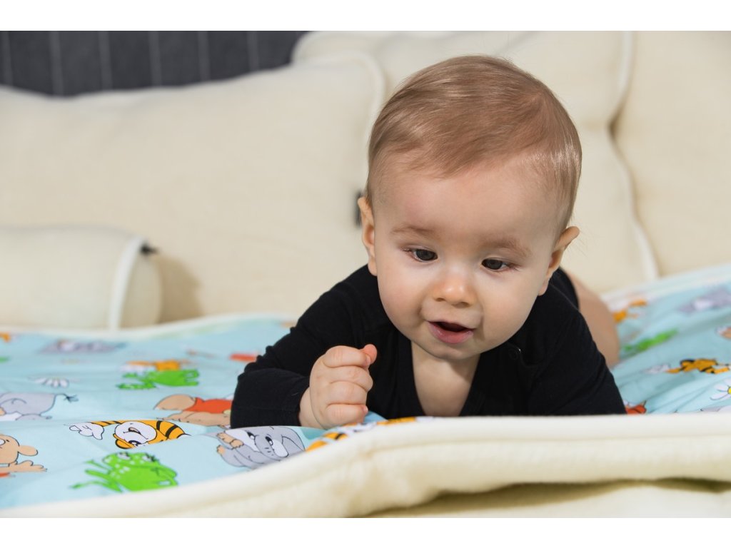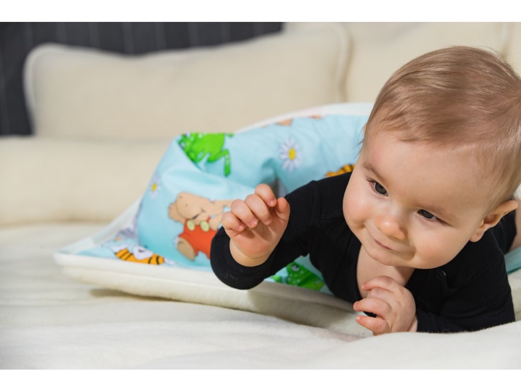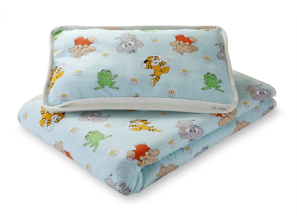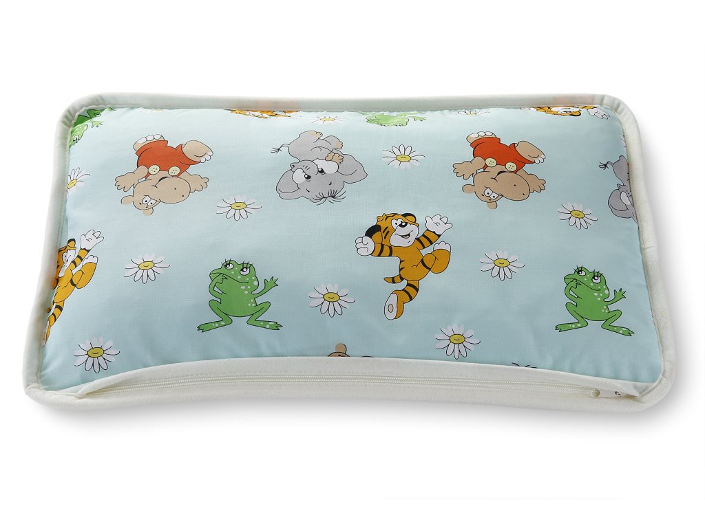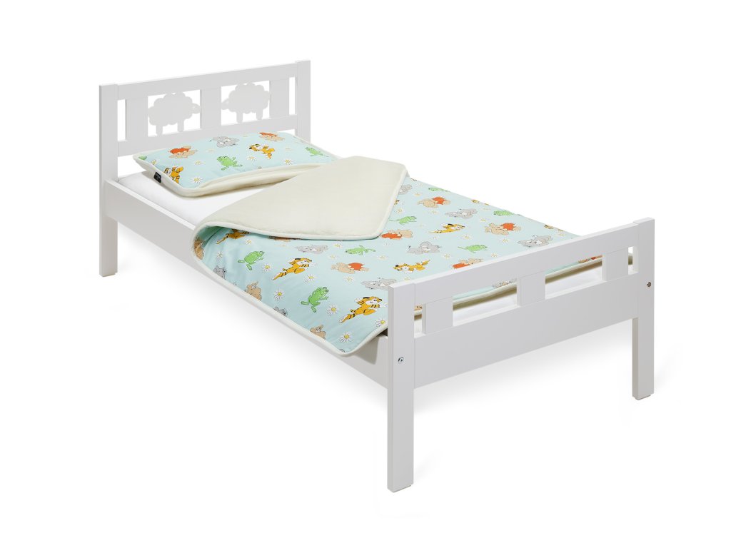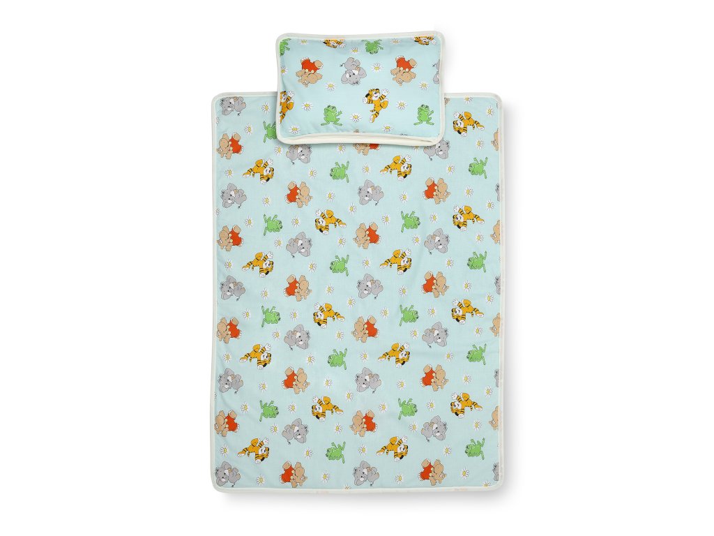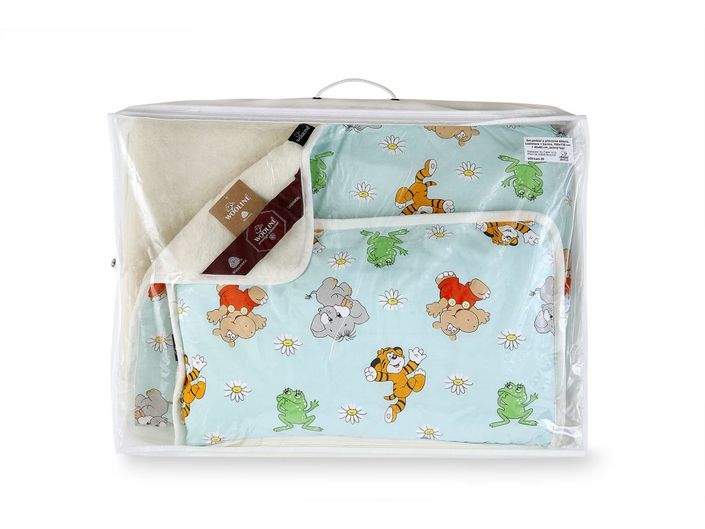 A kétoldalas takaróból és párnából álló gyermek szett a legkisebbek számára is ajánlott. A zöld oldalra vidám állatokat ábrázoló minták kerültek. A gyerekek örülni fognak az aranyos tigrisnek, elefántnak, békának és vidám vízilónak.