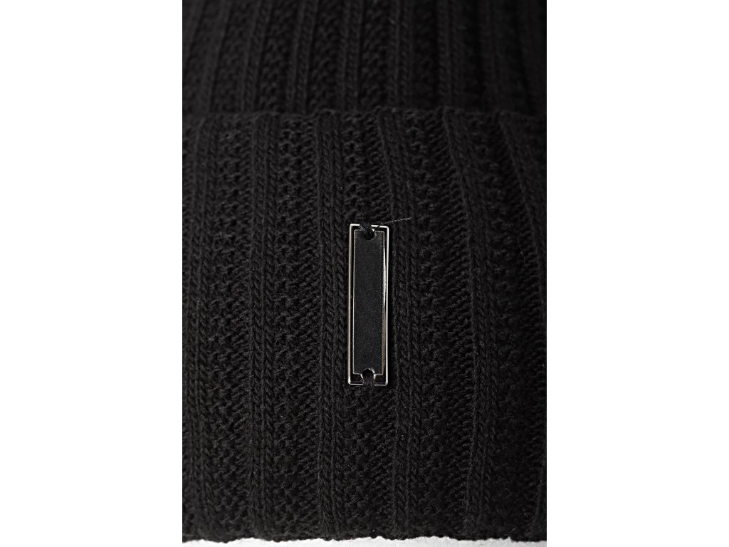 Gyönyörű és stílusos, egyszerű fekete színű, pomponos női téli sapka. A női sapka külső felülete géppel kötött. Ez a téli sapka dupla szegéllyel rendelkezik a homloknál, a füleknél és a tarkónál. Ez nagyon kényelmessé teszi a sapka viselését, mivel a dupla szegélynek köszönhetően kellemes meleget biztosít ezeken a problémás területeken, különösen télen. A belső kötés puha polár anyagból készült, amely nagyon finom és meleg tapintású.