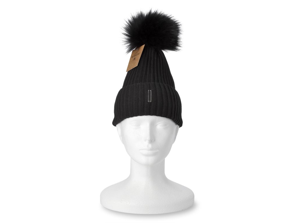 Női téli sapka fekete színben, természetes pomponnal. A puha, meleg, rugalmas téli sapka kellemes melegségével örvendezteti meg. A téli sapka sehol sem nyom, kívül és belül is puha tapintású. Előnye, hogy a sapka kézzel mosható. A belső gyapjúbélés magas hőérzetet biztosít. A dupla szegély védi a homlokot, a füleket és a tarkót.
